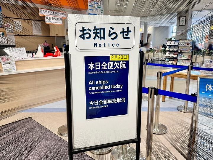 注)ストーリーの演出上、乗り場で突然欠航を知ったかのように書いていますが、人気のクルーズゆえにWebで予約をしてから現地を訪れていますし、ちゃんと前日に欠航となる旨のお知らせがメールで届いています。