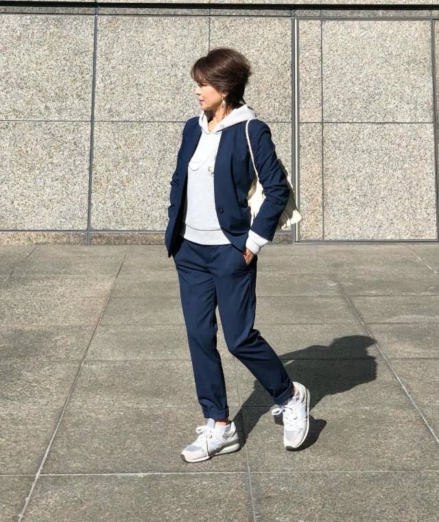 次にご紹介するのは、靴をボリューミーなスニーカーにしたジャケットセットアップコーデ。スタイリングはきれいめですが、足元をカジュアルにまとめることで、普段使いになじむバランスになりますよ。