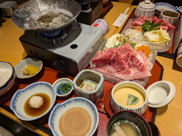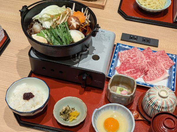 九州産A5ランクの黒毛和牛を、九州産醤油を使用した少し甘めの割下で仕上げ、コクのある福岡産「輝黄卵」に潜らせていただく「すき焼き鍋膳」(4950円)。