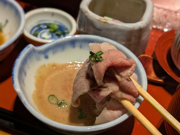 私はこちらの「和牛しゃぶ膳」(4950円)を試食しました。九州産A5ランク黒毛和牛のサーロインを使用した、贅沢の極みとも言える一品。