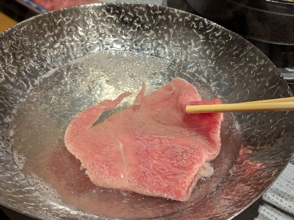 鍋にくぐらせた瞬間に、お肉の色がふわっと変わり、脂がとろけ出します。
