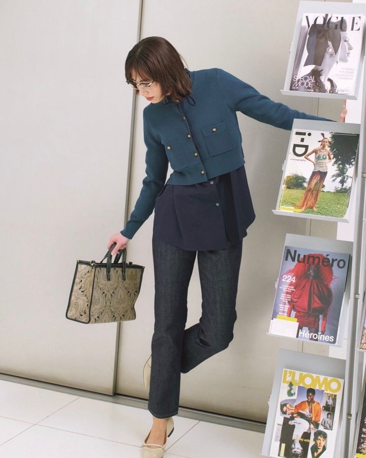 カーディガン¥20,900(ランバン オン ブルー)ブラウス¥9,990(PLST)デニムパンツ¥27,500(ヤヌーク/カイタックインターナショナル)メガネ¥59,400(アイヴァン/アイヴァン 東京ギャラリー)リング¥66,000(アガット)バッグ¥62,700(アヴァケーション/ノーベルバ)パンプス¥8,900(チャールズ&キース/チャールズ&キース ジャパン)