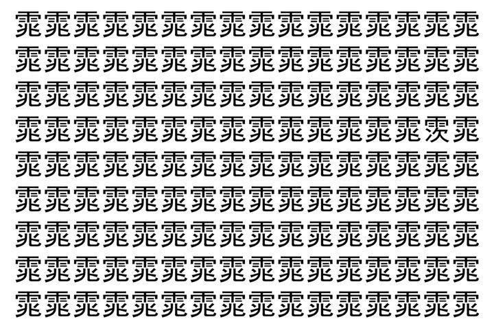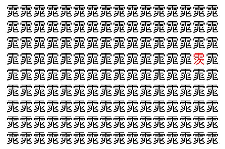 画像の中には、「雿」という漢字が縦に9行、横に16個並んでいます。 全部で144個となりますが・・・、そのうち1つは「異なる漢字」となってますよ!!