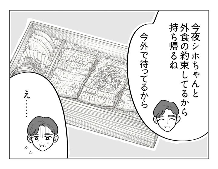 おぉ……。お義母さん、なんとか体裁を整えようとカットフルーツや冷凍の炊き込みご飯を付け足しましたね。あたかも今回のおすそ分けは「ウナギ弁当ひとつ」だけではなかったかのように見せかけていますが、こんなの……いつもおすそ分けを受け取り続けているシホさんは騙されません。トオルさんだけに連絡がきた上、おすそ分けがたったひとつのウナギ弁当だった事実に、シホさんは何を思うのでしょうか。