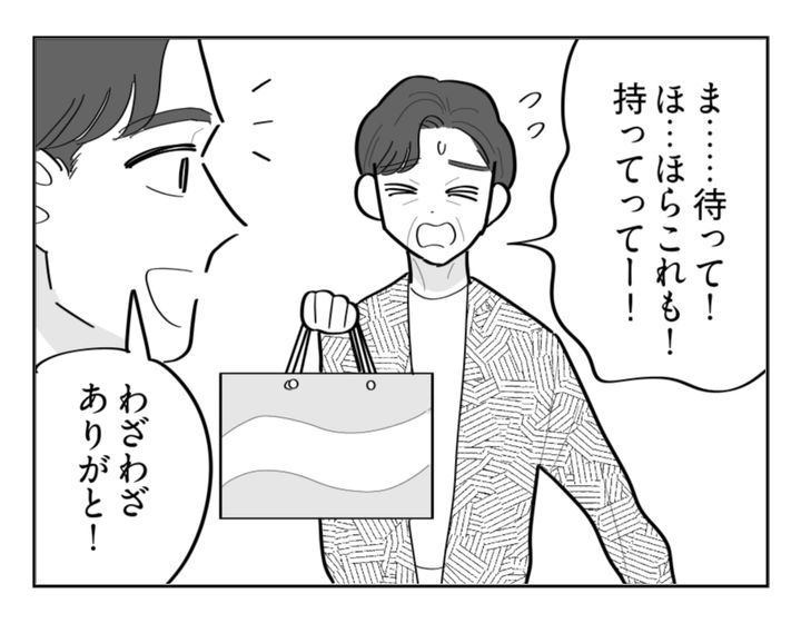 私(シホ)は夫のトオルと結婚して、夫婦2人暮らしをしています。結婚以来、義母からはたびたび「おすそ分け」の連絡が入ります。私は面倒くさいと思いつつも「これも親戚付き合いのひとつ」と割り切って取りに行っていました。しかしある日のこと。その日にかぎってなぜかトオルあてに連絡が来たのです。私が義実家の前で車を停めて待っていると、玄関を出てきたトオルの後から義母が慌てて追いかけてきて……?