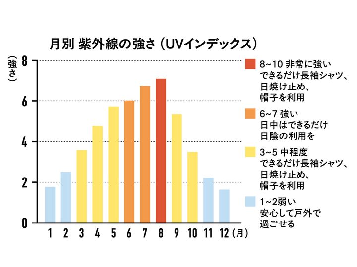 気象庁 「日最大UVインデックス(観測値)の月平均値の数値」 2006年〜2023年平均(つくば)