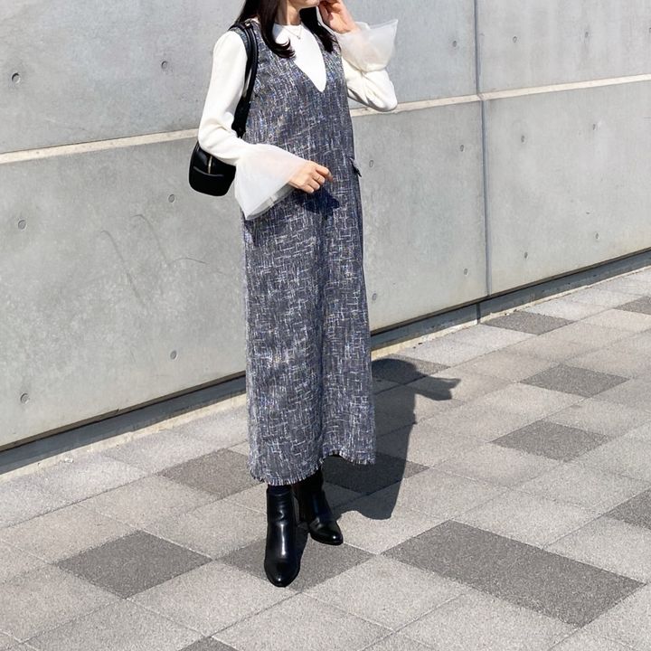 季節の変わり目に重宝するジャンパースカートは、素材選びで差がつきます。pearl3028さんは、表情豊かなツイード素材の一枚をセレクト。ゆったりとした着心地ながら、深めのVネックが顔周りをすっきりと見せ、きちんと感を演出します。インナーには袖口に透け感のあるシアーブラウスを合わせ、軽やかさと今っぽさをプラス。