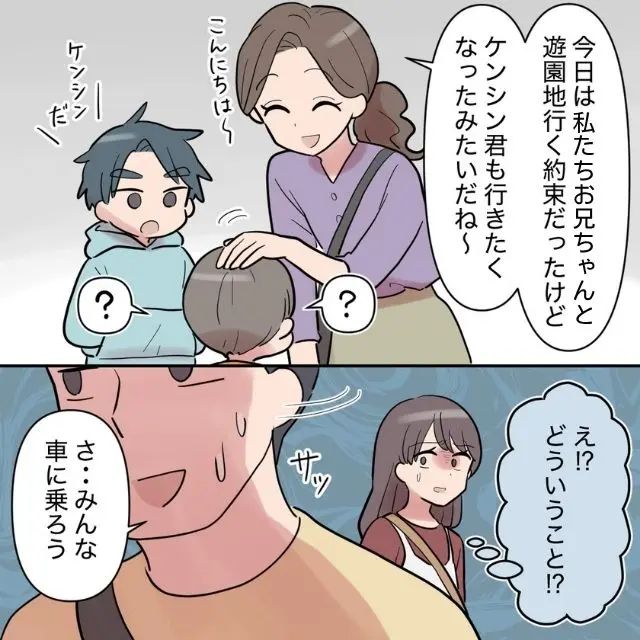 そして約束の日曜日。ケンシンは朝からウキウキです。駐車場に向かい「じゃあ出発・・」と車に乗ろうとした時、突然「ごめんごめん。遅くなっちゃった~」となぜかカオルさんとタイガくんが現れました。状況が飲み込めず「え・・」と固まっていると、「あーーー。今日はみんなで行こうと思って・・。いやぁ~、あはは」とシンジがヘラヘラ笑いながら言いました。「は?」私がそう聞き返すと、