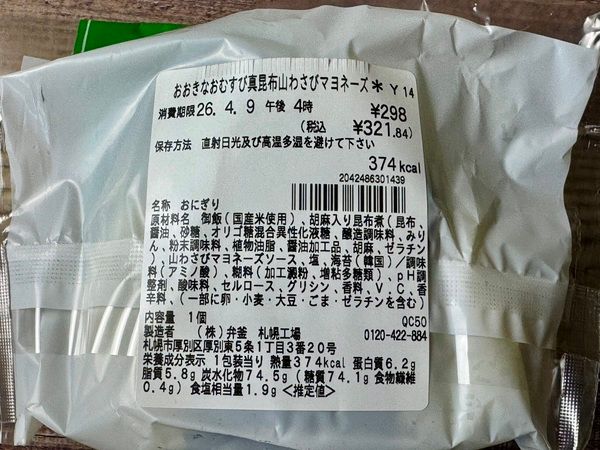 北海道道南間昆布使用 おおきなおむすび真昆布山わさびマヨネーズ (321.84円)