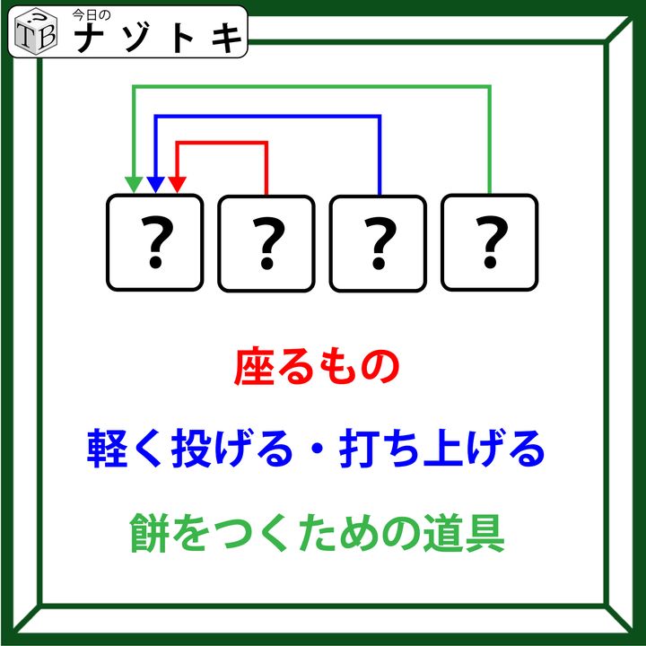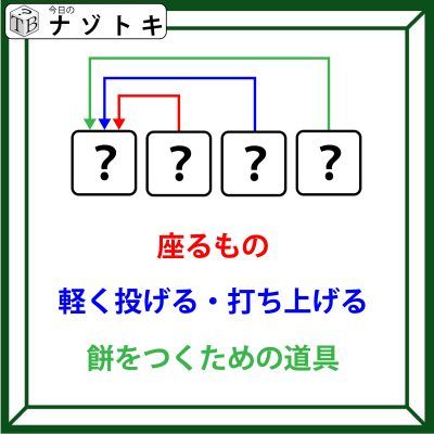 「座るもの」は難しく考えず素直にあの2文字がはいります。「餅をつくための道具」とは餅をついている方ではなくイレモノの方をさしています。