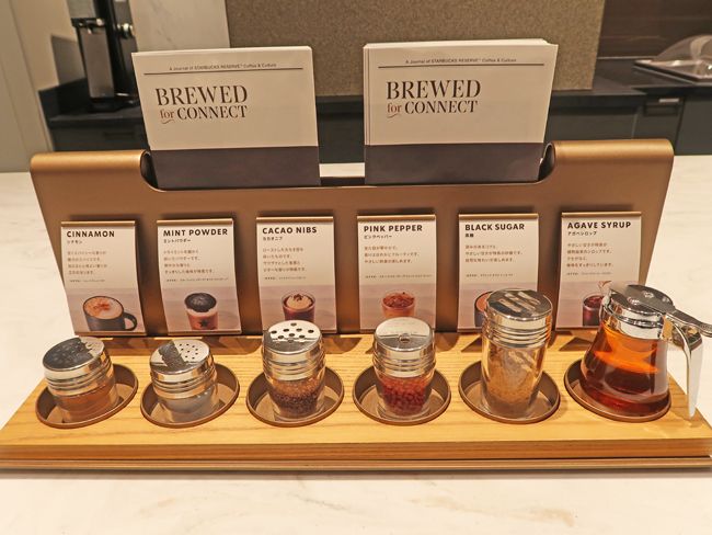 ちなみに、コーヒーの受け渡しカウンターの横には、「カカオニブ」「黒糖」「ピンクペッパー」「ミントパウダー」「シナモン」「アガベシロップ」の6種類のコンディメントが揃う「コーヒーディスカバリーカウンター」(写真上)があり、オーダーしたコーヒーを自分好みにアレンジすることができます。POPには相性の良いコーヒーを提案してくれているので、まずはそれから試してみて。