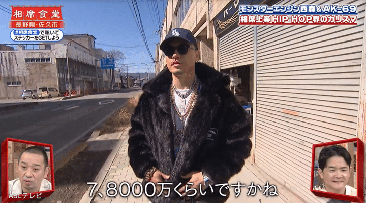 そんなAK-69は、ロケで長野県佐久市へ。身に着けている大量のネックレスはすべてオーダーメイドで、その総額は「7、8000万円くらい」とのこと。「これは1000万くらいだったかな」「これ800万ぐらい」「これも1500万近く」などと、AK-69は1つずつ価格とともに紹介し、スタジオでVTRを見守るお笑いコンビ・千鳥に衝撃を与えた。