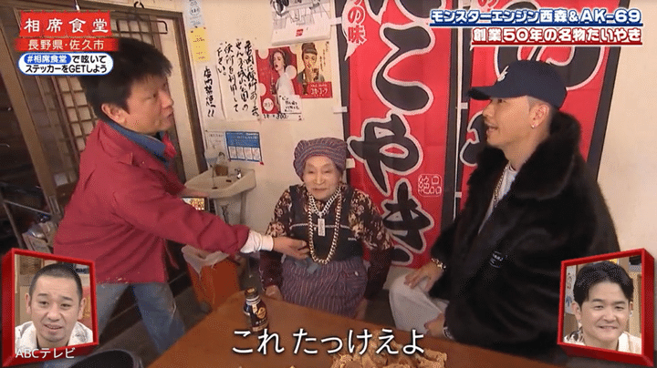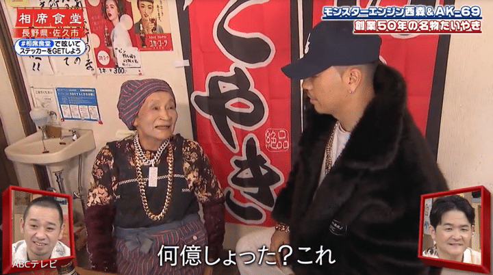 やがてAK-69は、82歳の女性が手作りする昔ながらのたい焼きの店にたどり着いた。コワモテだが優しくてノリがいいAK-69は、あの高級私物ネックレスを女性の首にかけてあげた。嬉しそうにカメラにポーズを向ける女性に、AK-69も笑顔だ。