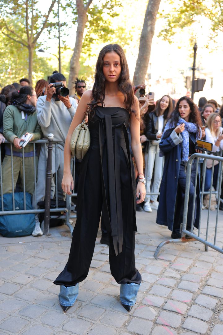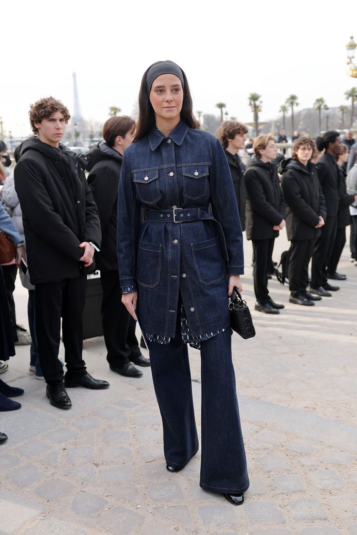 父ハイメ・デ・マリチャラルと出席したパリコレで披露したのが、ダメージデニムを、肩掛けのブレザーとディオールのアイコニックなサドルバッグで格上げした高度なハイ&ローミックス。足元のビジュー付きパンプスと手首に巻いたスカーフが、装いにさらなる華やかさを添えています。