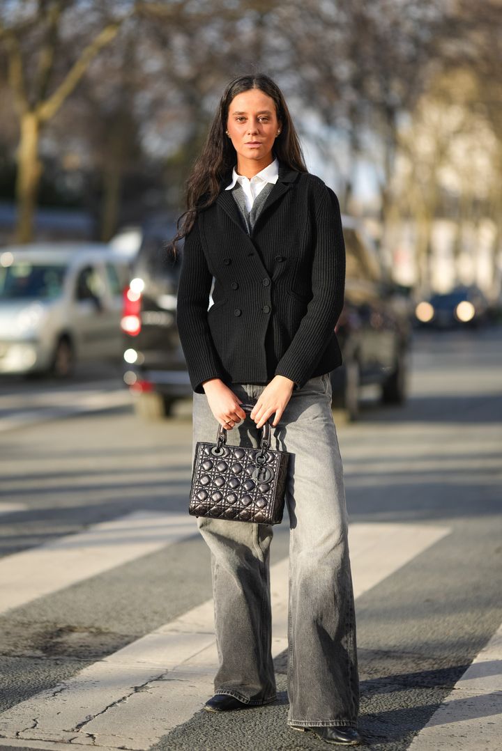 ディオールのアイコンバッグ「レディ ディオール」を、あえてグレーのワイドデニムでカジュアルダウン。ダブルボタンのニットジャケットを羽織り、パリの街角が似合うシックな装いに。ハイブランドを日常に溶け込ませる彼女のセンスが光る、真似しやすい洗練ストリートスタイルです。