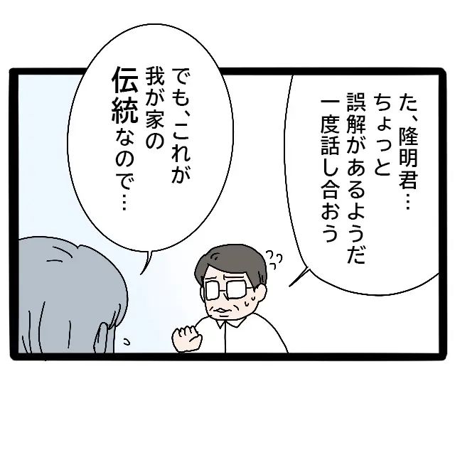 すると、「た、隆明君・・ちょっと誤解があるようだ。一度話し合おう」父が慌ててそう言うも、「でも、これが我が家の伝統なので・・」とどこかで聞いたような言葉をサラリと言う隆明。