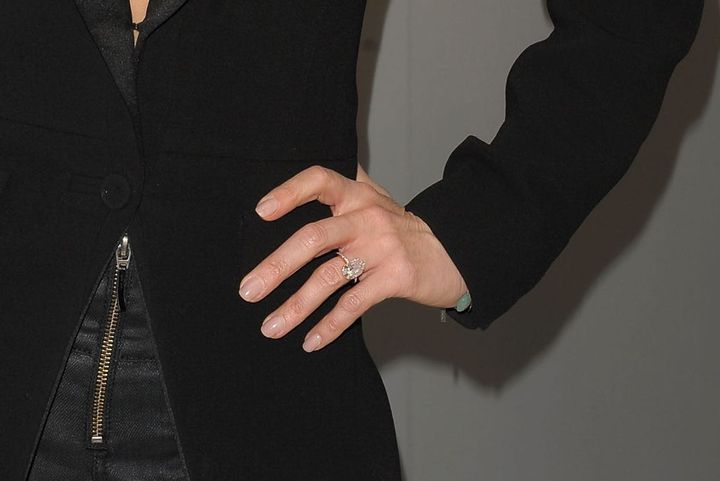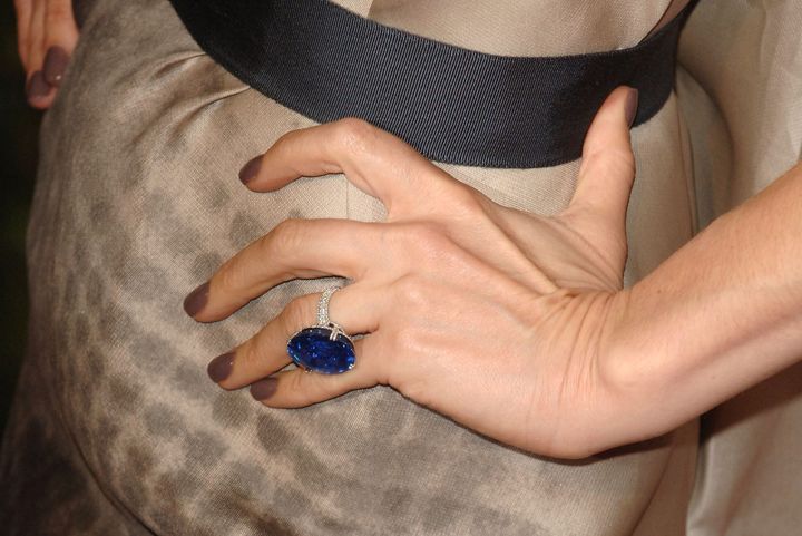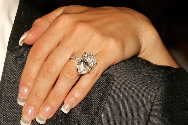 推定価格:約160万ドル(約1億8400万円)2003年のMTVムービー・アワードで、世界中の視線を釘付けにしたのがこちら。サイドにバゲットカットのダイヤモンドを配した、推定6カラットのエメラルドカットのダイヤモンドのリングです。その圧倒的な透明感と輝きは、まさにパワーカップルとしての地位を確立した2人にふさわしい婚約指輪といえるでしょう。