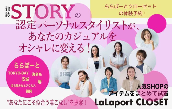 「STORYが街に出る!」をコンセプトにスタイリングサービスを行うイベントです。誌面でも活躍中のSTORY認定パーソナルスタイリストたちが、あなたの体型や雰囲気に合う服を探しながら、トレンドの着こなしをアドバイスします。会場はららぽーと内のさまざまなブランドの中から選りすぐりの旬を集めたセレクトショップ「LaLaport CLOSET」。気にいった服は、その場でららぽーとのECサイト〈&mall〉から購入できるので、手ぶらでSHOPPINGが楽しめます。