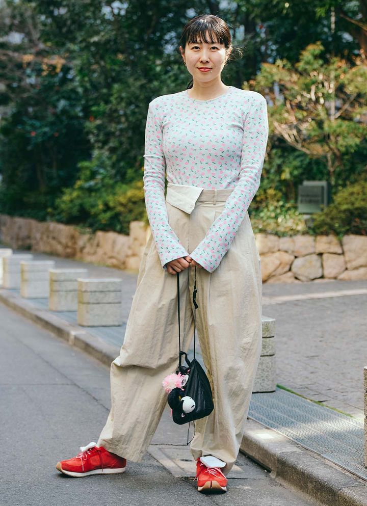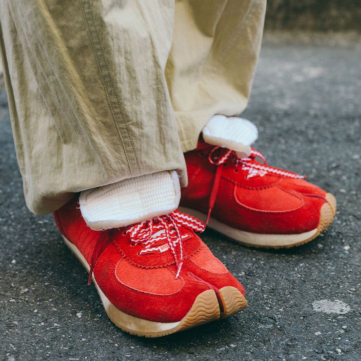 足元はアパレルブランド『シーロン』が、足袋シューズメーカー『ラフィート』とコラボしたスニーカー。鮮やかなレッドカラーでコーデを引き締めて。