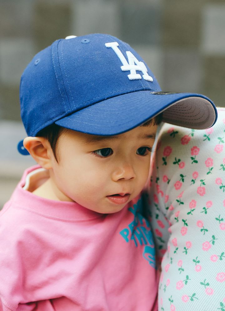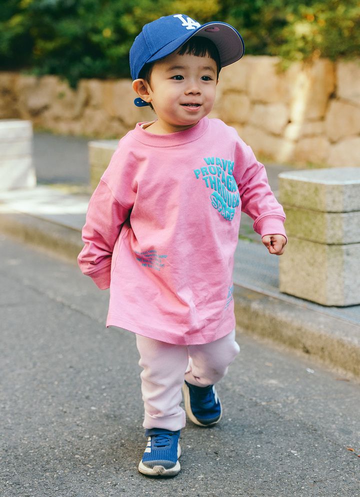 ピンク×ブルーでつくる、春ムード全開のカラーリンクコーデが到着! トップスでやわらかくテンションを揃え、レッドのスニーカーとブルーのキャップが絶妙な挿し色に。見ているだけでワクワクする配色テクが詰まった親子コーデの完成♪
