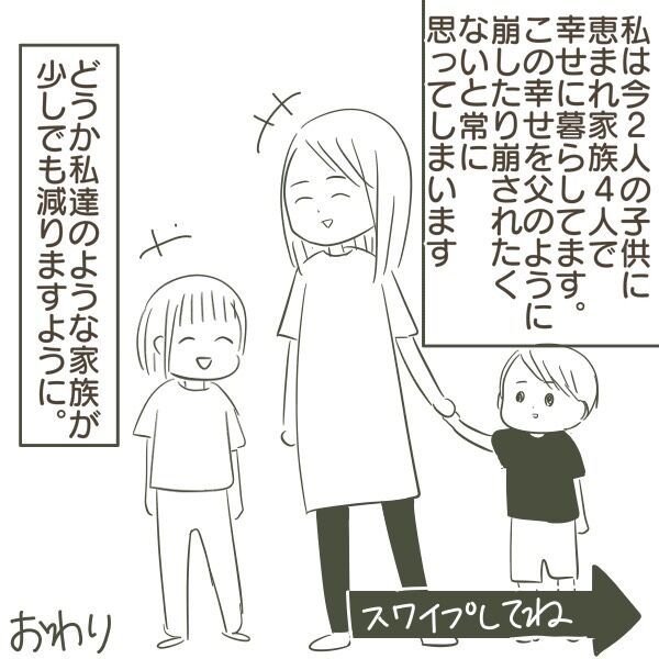 不倫をしている人は「誰かの幸せを犠牲にしている」ということをもう一度考えてほしいです。私達のような家族が少しでも減りますように…。そして今回で『父がW不倫して家庭崩壊した話』は完結です。これまでお読みいただき、ありがとうございました!