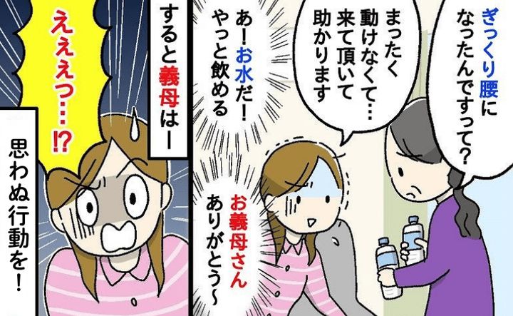 「ちょっ…!」ぎっくり腰で動けない私…2本の水を持って現れた義母。次の瞬間、義母が思わぬ行動を!
