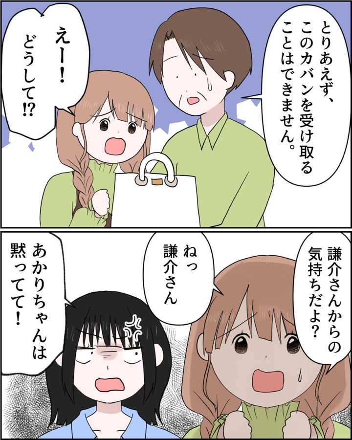 「とりあえず、このカバンを受け取ることはできません」と言って叔父さんはあかりちゃんがもらったカバンを返そうとしました。すると、あかりちゃんは「えー!どうして!?謙介さんからの気持ちだよ?ねっ謙介さん」とやはり反省ゼロで謙介にすがろうとしましたが、すかさず舞花ちゃんが「あかりちゃんは黙ってて!」とぴしゃり。
