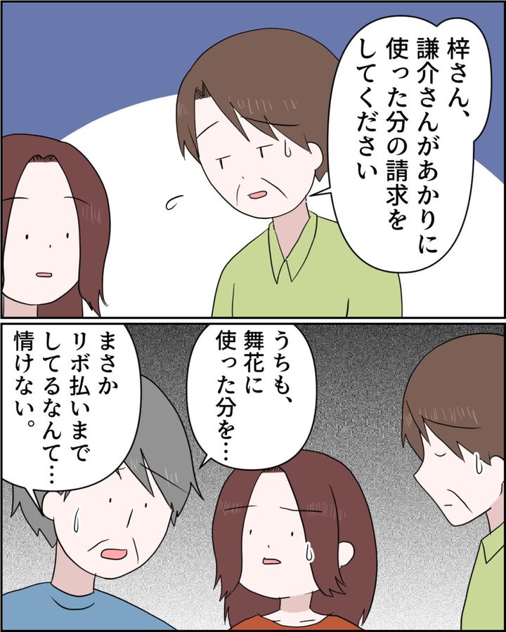 そして、叔父さんは「梓さん、謙介さんがあかりに使った分の請求をしてください」と申し訳なさそうに言い、義父も「うちも、舞花に使った分を・・。まさかリボ払いまでしてるなんて・・情けない」と肩を落として言いました。
