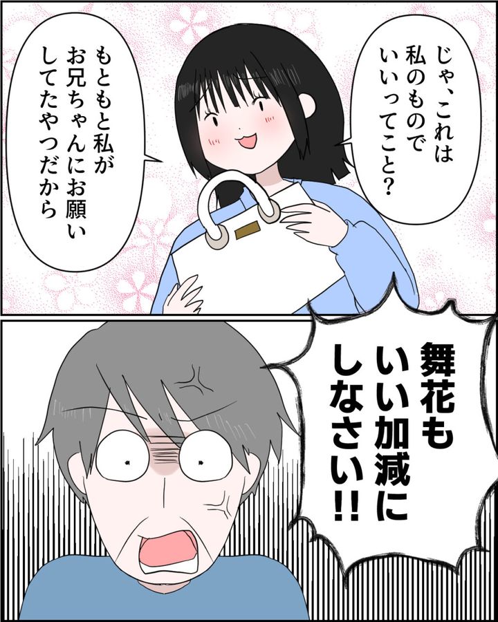 しかし、あかりちゃんに厳しい言葉を言い放った舞花ちゃんは「じゃ、これは私のものでいいってこと?もともと私がお兄ちゃんにお願いしてたやつだから」とにんまりしてカバンを手に取りました。さすがの義父も我慢の限界だったようで「舞花もいい加減にしなさい!!」と物凄い剣幕で声を荒げました。