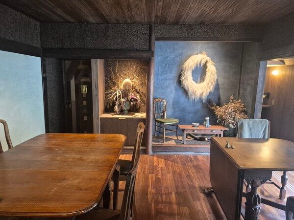 アンティークの欄間やワイルドフラワーのアレンジメントに彩られた、古民家風でどこかミステリアスな空間です。