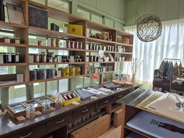 受付横の扉を開けると、地元の素材を使用したシロップやピクルスなどの瓶詰商品、オリジナル雑貨が並ぶショップが広がっています。