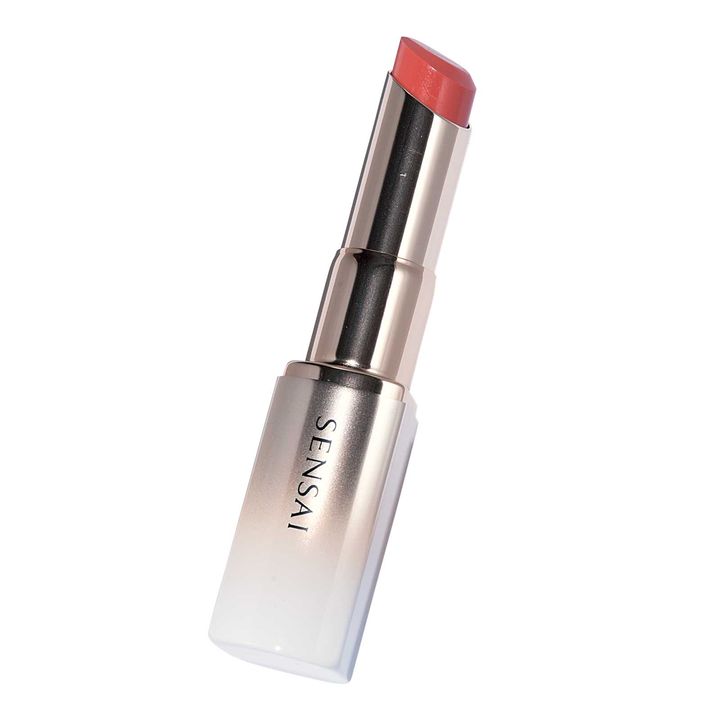 彩度の高い明るめベージュ。唇をふっくら見せつつ、知的な印象に。SENSAI モイスチャーインテンスリップスティック MI07 ¥4,180、同 リップスティックホルダー ゴールド(限定) ¥1,650()