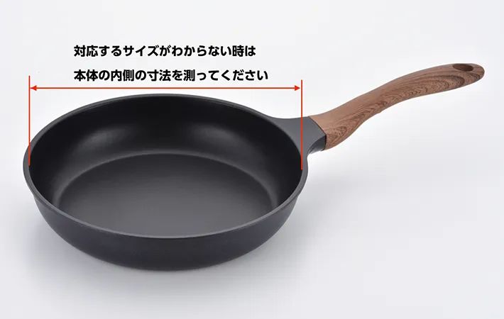フライパンのサイズ表示(20cm、26cmなど)と同じ寸法の蓋を選びます。分からない場合は、フライパン本体の内側を定規やメジャーで測ってください。