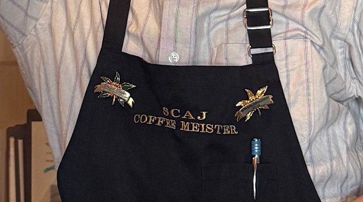 胸に光るSCAJアドバンス・コーヒーマイスター