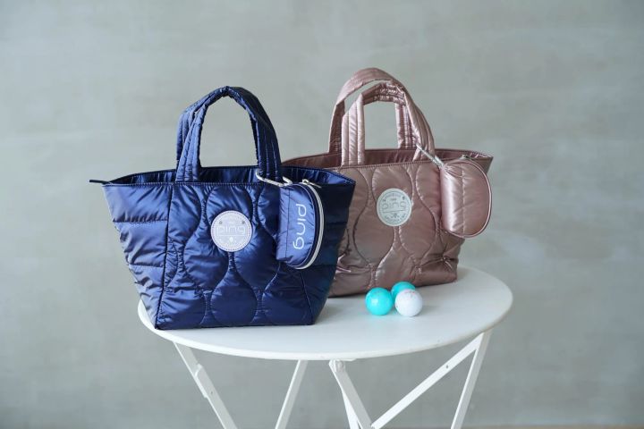 シャイニーなファブリックが華やかなトートバッグ。おそろい素材のボールポーチをストラップに付けると、さらに可愛らしく機能的に。ニュアンスカラーのゴルフウェアに合わせて、スパイシーな配色を楽しみたい。