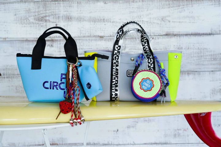 お気に入りのチャームやボールポーチをバッグに付けて、鮮やかなバッグをさらにポップに遊ぶのもイイ。耐久性や撥水性の高いウェットスーツ素材のバッグは、ボーイズカジュアルな着こなしに好相性。汚れにくく、小雨が降っても安心。