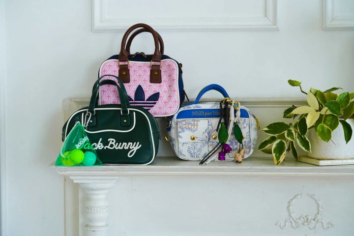ピンクのバッグ¥16,500(アディダスゴルフ/アディダス ゴルフお客様窓口)グリーンのバッグ¥14,300(ソックスとセットで)¥5,500(共にジャックバニー!!)白のバッグ¥29,700(NS23parNissaGolf/ジュニアー東京支店NissaGolf事業部)バッグにつけたチャーム各¥11,550(ヴィアメイルバック/ティースクエア プレスルーム)