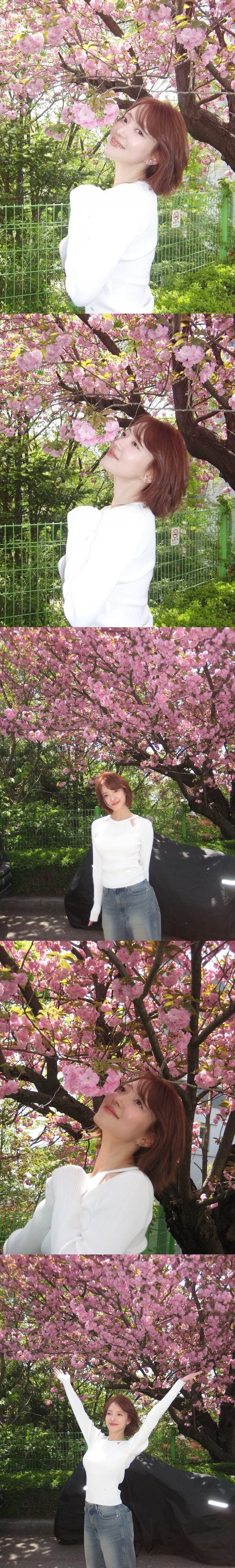 写真には、満開の八重桜の木の下で多彩なポーズを取るイ・セヨンの姿が写っている。咲き誇るピンク色の八重桜と見事に調和した彼女は、まるで一枚の絵画のような雰囲気を醸し出している。