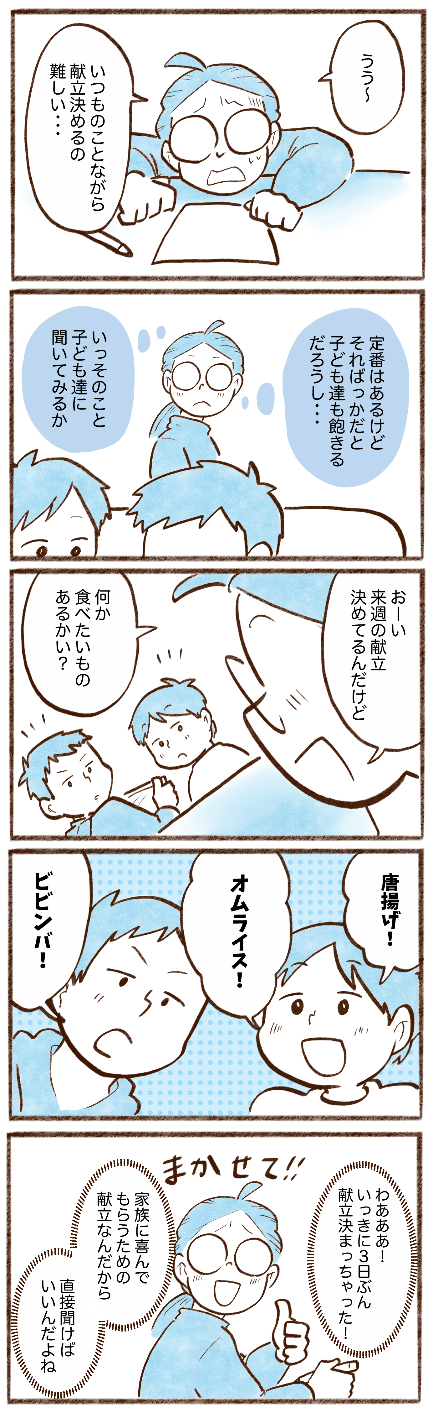 冷蔵庫を開けて考えたり、レシピサイトを眺めたりしているうちに、あっという間に時間が過ぎてしまうこともあります。そんなときは、家族に「何が食べたい?」と聞いてみるのもひとつの方法。ひと言リクエストをもらえるだけで、献立の方向性が見えやすくなり、買い物もぐっとラクになります。