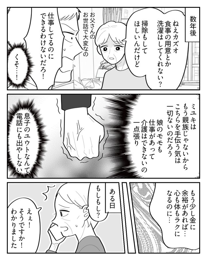 俺はカズオ。両親が年老いたので、実家で同居をはじめました。元妻のミユキは「介護がイヤだから」と離婚を決めた薄情者です。娘のモモは結婚して引っ越したし、息子のユウトなんて仕事が忙しいと言って顔も見せません。本当に恩知らずなヤツらです。俺は仕事しているから、とても家のことまで手がまわりません。母が足の悪い父の面倒を見ていますが、かなり大変そうです。こんなときもっとお金があれば、いろいろと楽になるはずなのですが……。