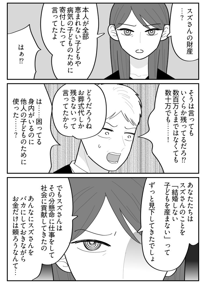 元妻に言われて青ざめました。スズさんはまだ生きているうちに、財産を全部どこかに寄付してしまったというのです。まさか……そんな……! よその子に気前よく恵んで、身内には何も残していないなんて、その事実に絶句しました。