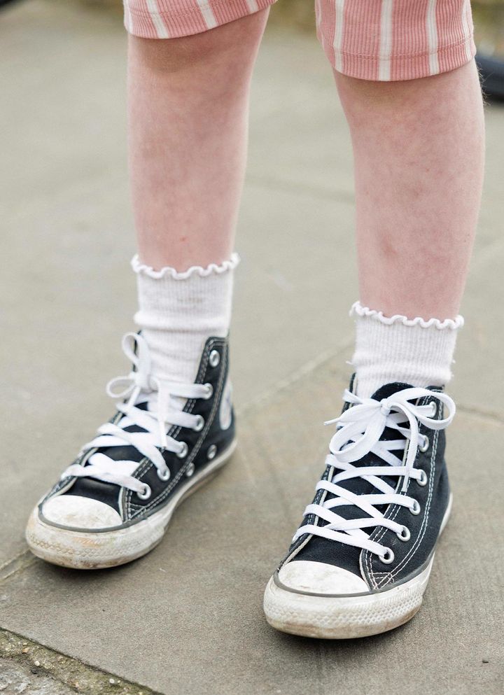 お姉ちゃんが履いている『コンバース』のハイカットスニーカーには、フリルソックスを合わせてガーリーカジュアルに。