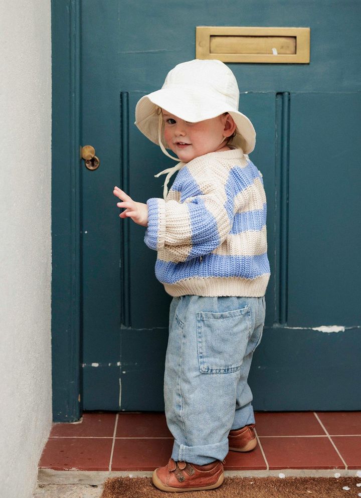 NAME:テディくん(1歳)パステルブルー×ホワイトのボーダーニットを主役に、同系色の淡いウォッシュドデニムを合わせてとことんさわやかにコーディネート。外出時の日除けに便利なバケットハットやサングラスも同系色で合わせて、おしゃれなマリンルックの完成!ザ・ニューソサエティーのニット、ヴィンテージのデニムパンツ、ザラのハット、ハンプトンクラシックスのシューズ