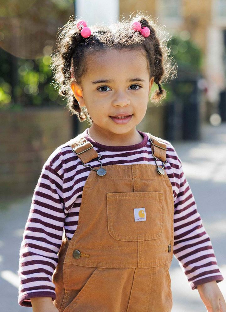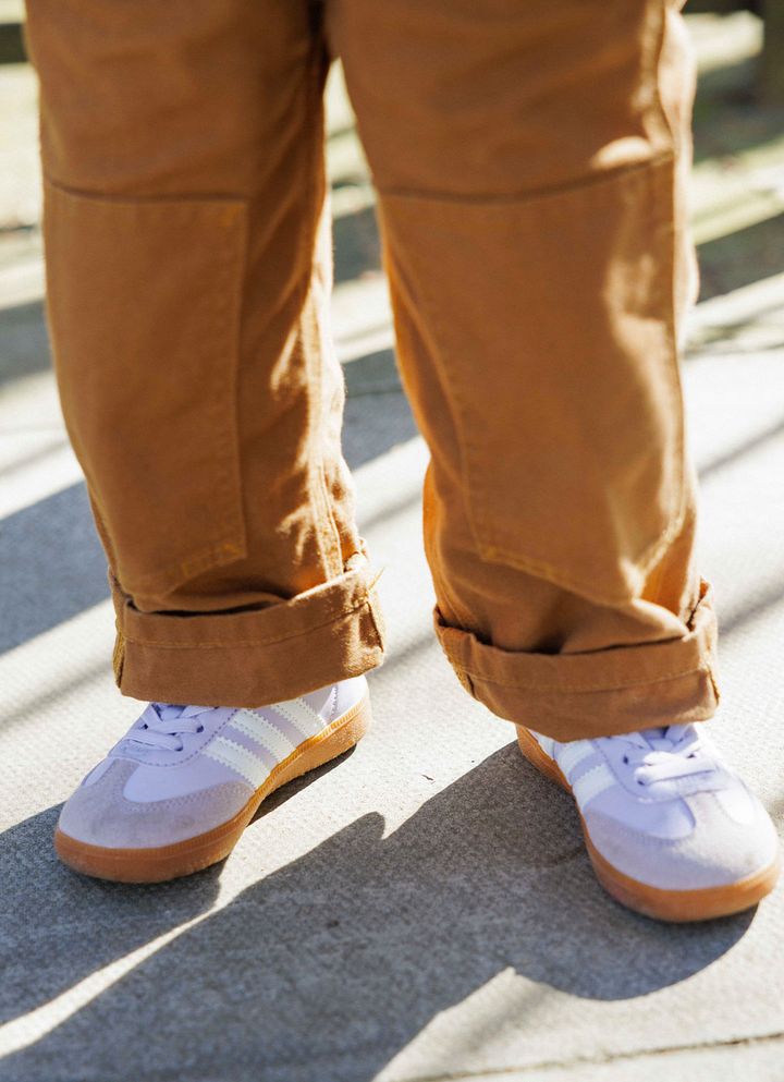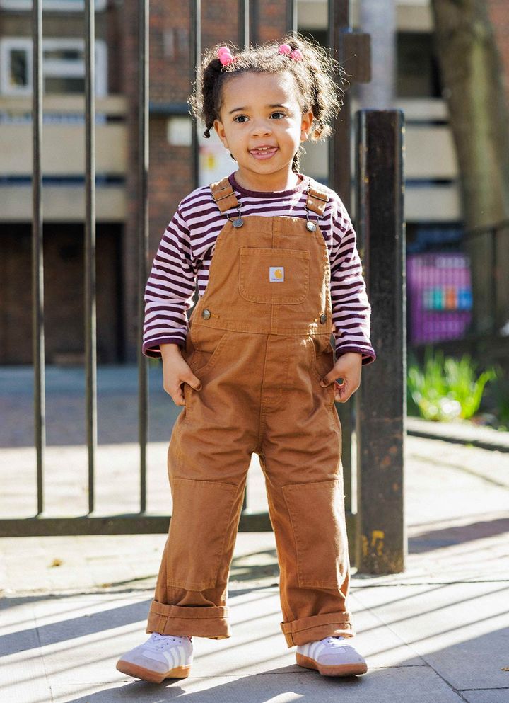NAME:アンバーちゃん(3歳)『カーハート』のオーバオールと『アディダス』のスニーカーでトレンドを押さえたアクティブなボーイッシュスタイル。合わせるアイテムをピンクに統一することで、女の子らしいガーリーな格上げに成功!カーハートのオーバーオール、ザラのロンT、アディダスのスニーカー