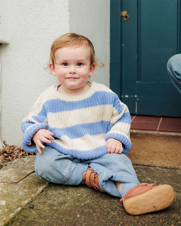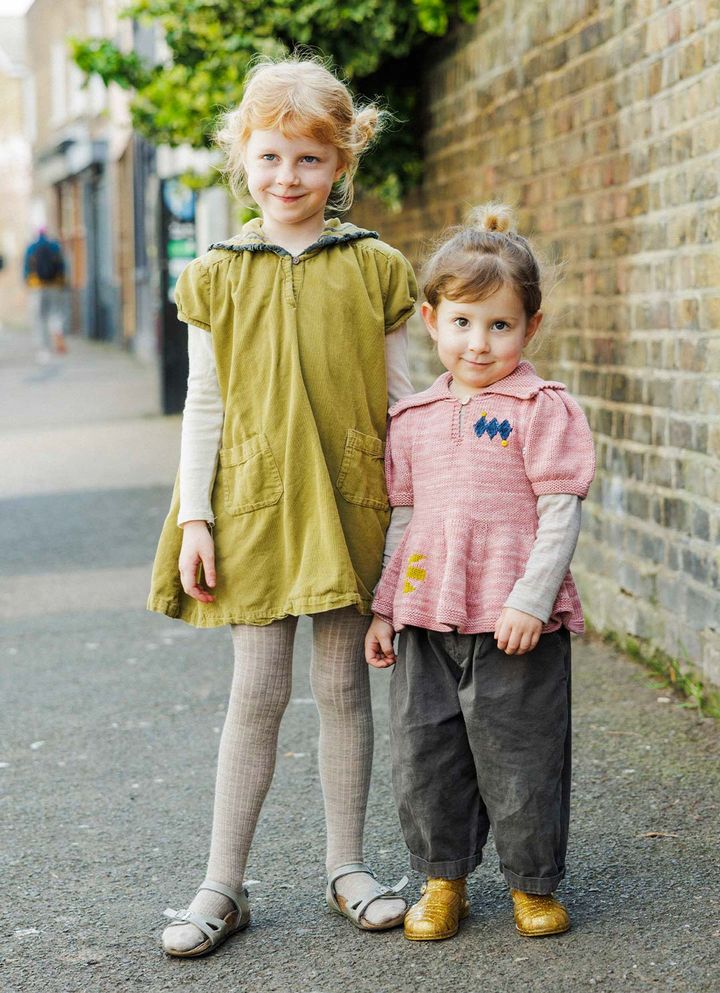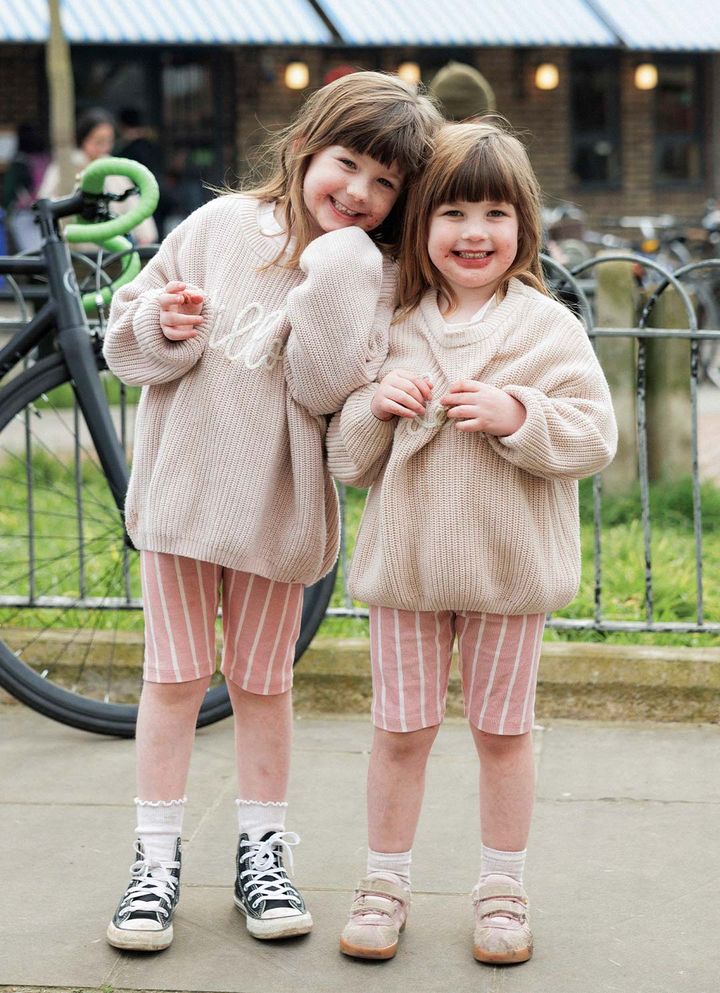 NAME:ウィローちゃん(5歳)&フローレンスちゃん(3歳)名前入りのニットトップスとストライプ柄のショートパンツをお揃いで着た仲良し姉妹。オーバーサイズのトップスとタイトなショートパンツでメリハリの効いたシルエットが新鮮![older sister]エッツィーの名前入りニット、セインズベリーズのTシャツとショートパンツ、H&Mのソックス、コンバースのスニーカー