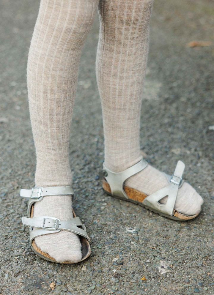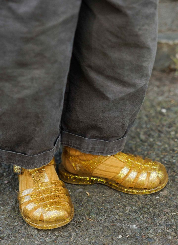 『ライウッド』のサンダルはゴールドグリッターがインパクト抜群! まだまだ涼しいロンドンの春は、同系色のソックスと合わせるのがおしゃれのカギ。