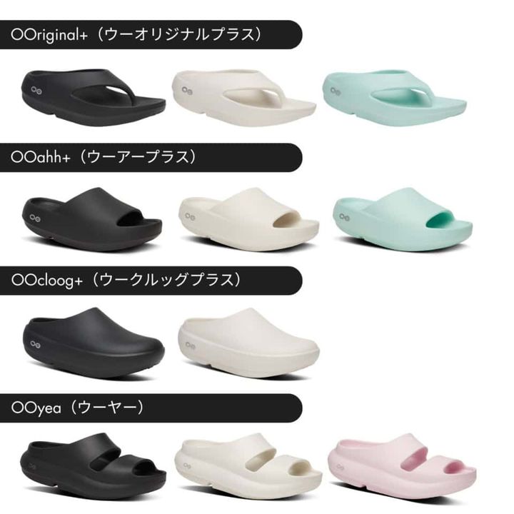 定番から新作まで、カラーやデザインのバリエーションも豊富に揃うラインナップ!OOriginal+(ウーオリジナルプラス)全3色 ¥11,880、OOahh+(ウーアープラス)全3色 ¥11,880、OOcloog+(ウークルッグプラス)全2色 ¥12,980、OOyea(ウーヤー)全3色 ¥11,880 (OOFOS) ※ポップアップにて購入可能