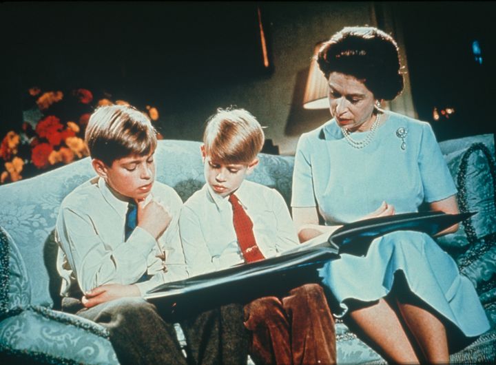 アンドルーとエドワード王子とともに写真アルバムを見ているエリザベス女王。この場面の映像は、1971年の女王のクリスマス放送で、家族というテーマを表現するために使用されたものだという。