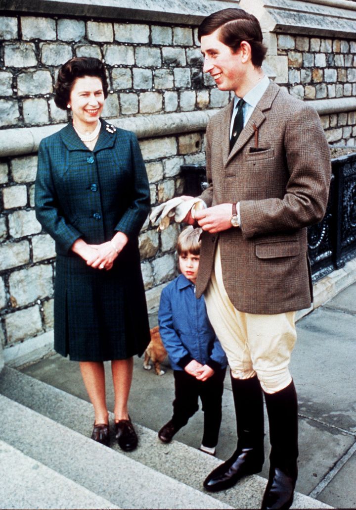 ウィンザーの自宅で撮影された1コマ。チャールズ国王とエリザベス女王の微笑ましい談笑の間でちょこんと立っているエドワード王子が可愛い(後ろには女王の愛犬も)。
