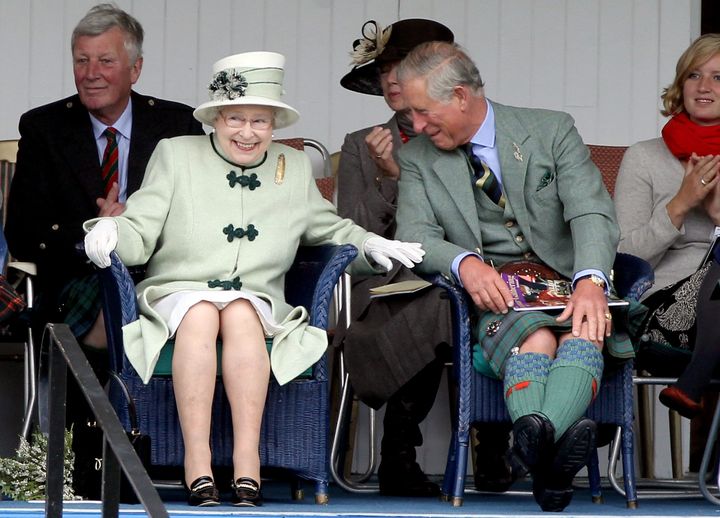 ブレマー・ハイランド・ゲームズの綱引き競技を観戦しながら笑い合うエリザベス女王とチャールズ国王。とっても楽しそうな女王の姿が印象的だった。
